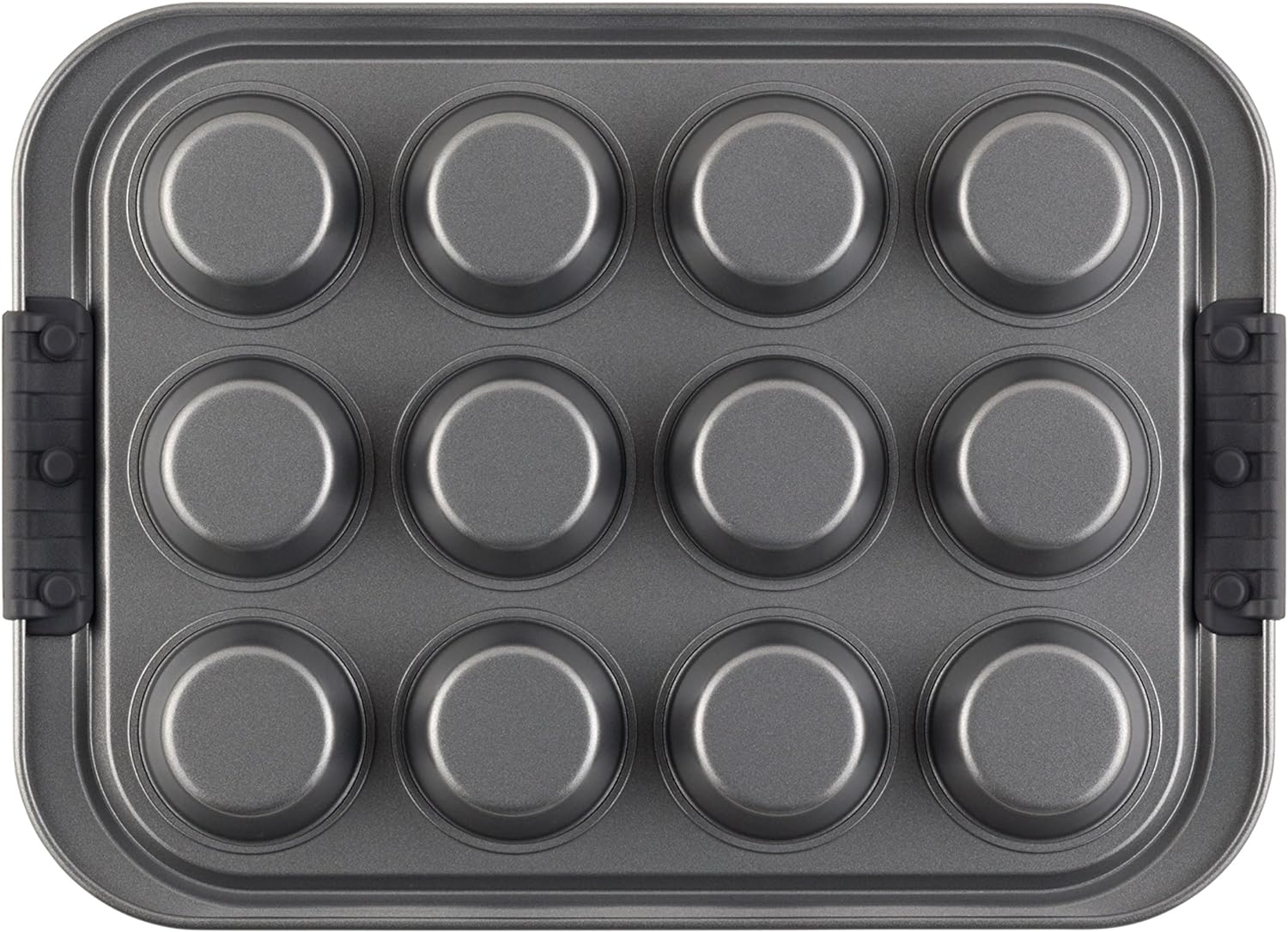 From morning muffins to birthday cupcakes, the Anolon Advanced Bronze Nonstick Bakeware 12-Cup Muffin Pan with silicone handle grips is designed to make baking easier and more efficient. Anolon Bakeware is designed and constructed to measure up to the high standards of dedicated, creative home bakers. Use the muffin pan to prepare a dozen applesauce spice muffins for brunch with friends or bake your own version of Meyer lemon-and-blueberry cupcakes. Constructed of heavy-duty carbon steel, Anolon Advanced Bronze Bakeware has all the features and benefits of regular Anolon Advanced Bakeware, with a warm and distinctive bronze exterior that coordinates with the Anolon Advanced Bronze Cookware collection. Oven safe to 450 Degree, the muffin pan resists warping and provides the even heat distribution fundamental to successful baking results. The medium color tone aids in even browning and inside and out the stylish bronze-colored nonstick coating provides optimum food release. The wide rim and rubberized handles provide ample space for solid grip and comfortable grasp when transferring delicious cake layers to a cooling rack, even with bulky oven mitts. Best of all, the muffin pan is backed by the Anolon Lifetime Warranty. This gourmet-quality muffin pan is the perfect complement to other Anolon Advanced Bronze bakeware products and the kitchenware throughout the complete Anolon collection. Mix up some baking creativity with moist muffins, decadent cupcakes and much more with the Anolon Advanced Bronze Nonstick Bakeware 12-Cup Muffin Pan that bakes beautifully.