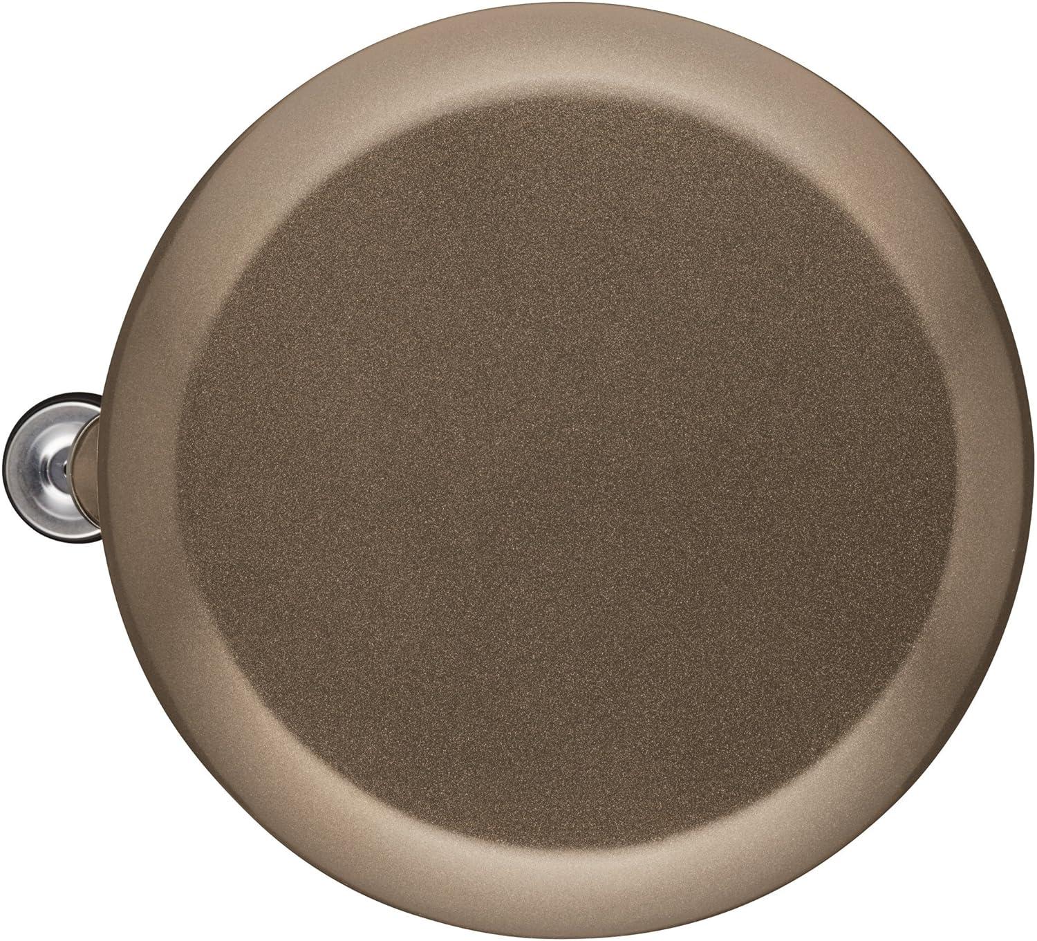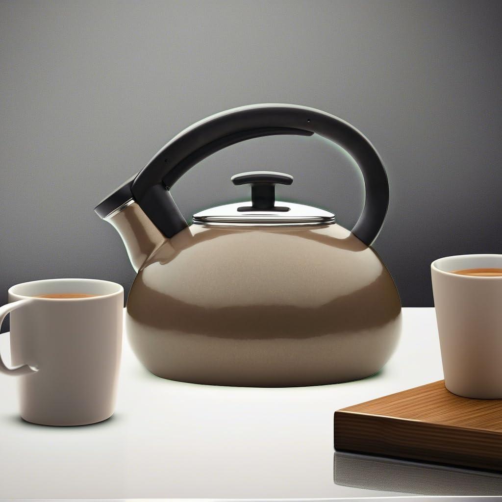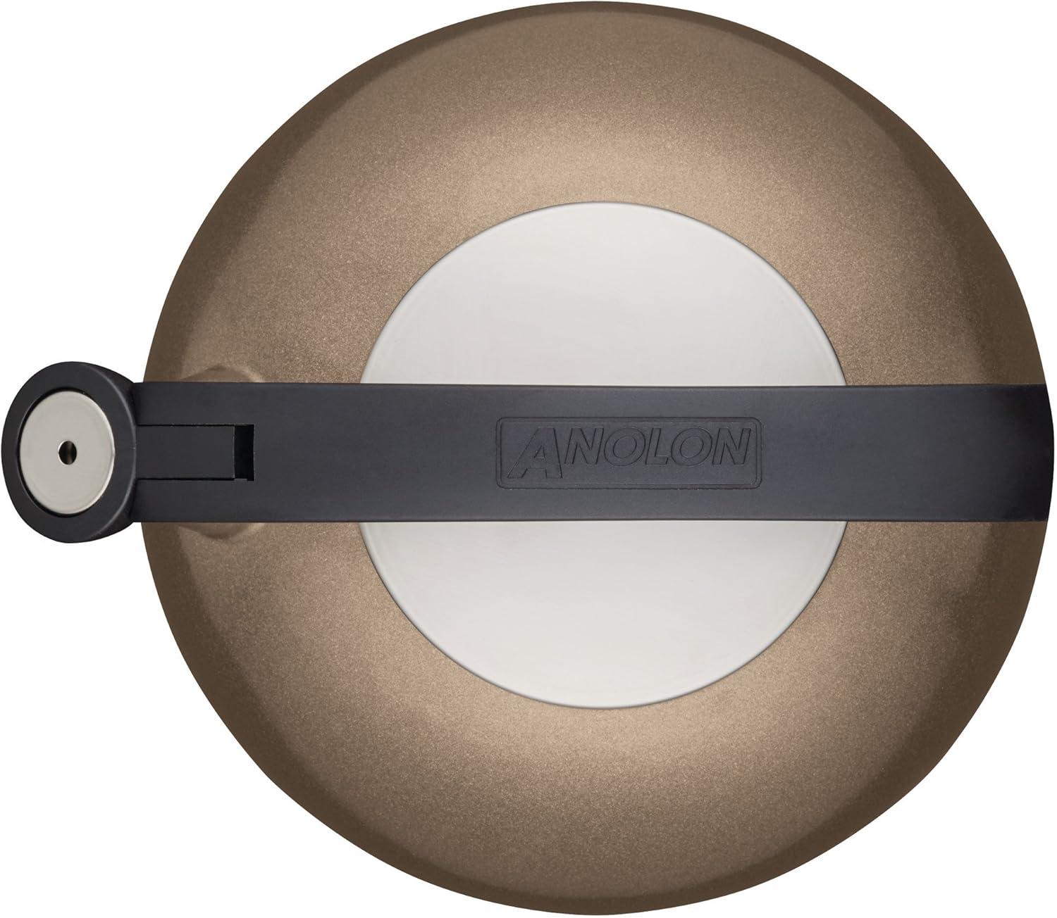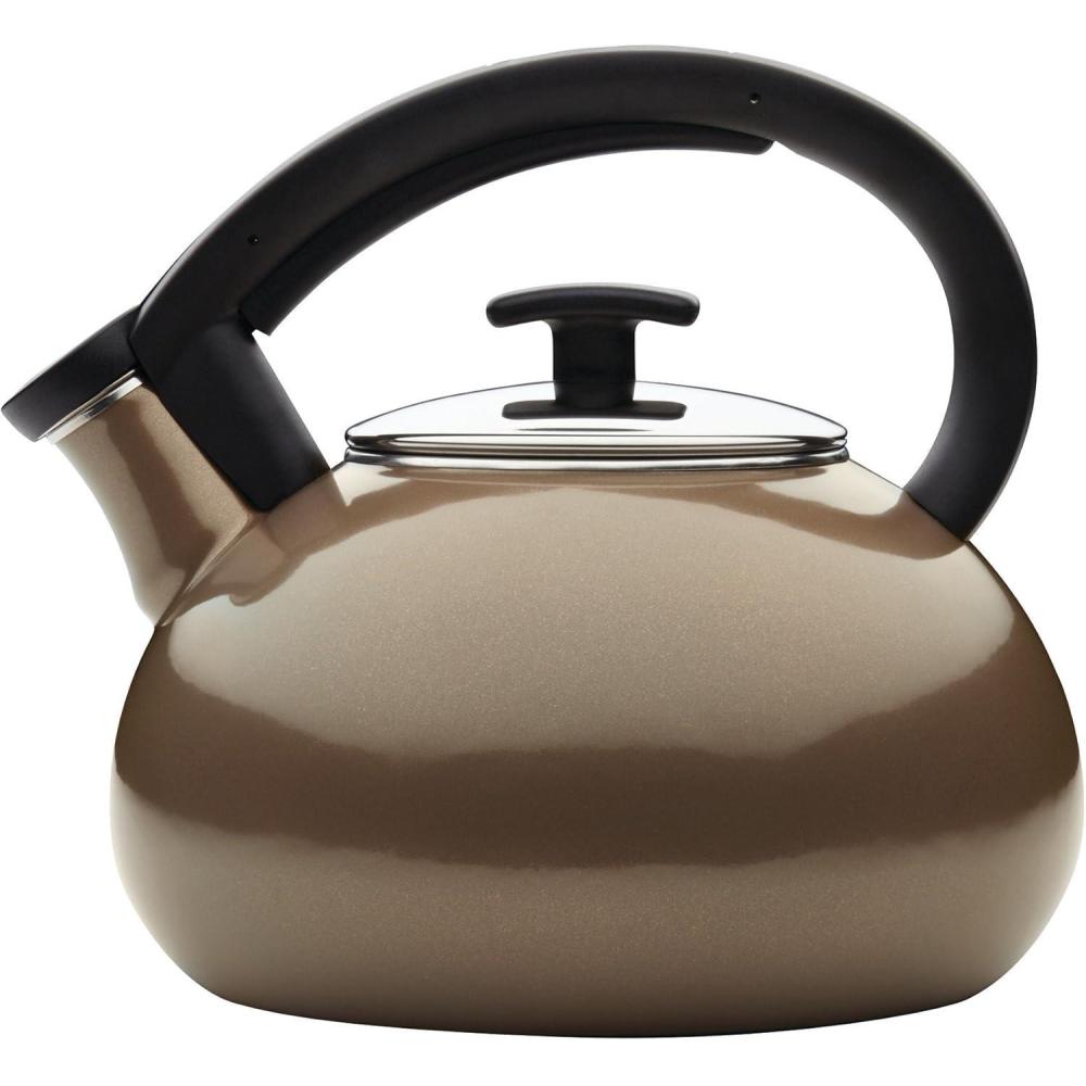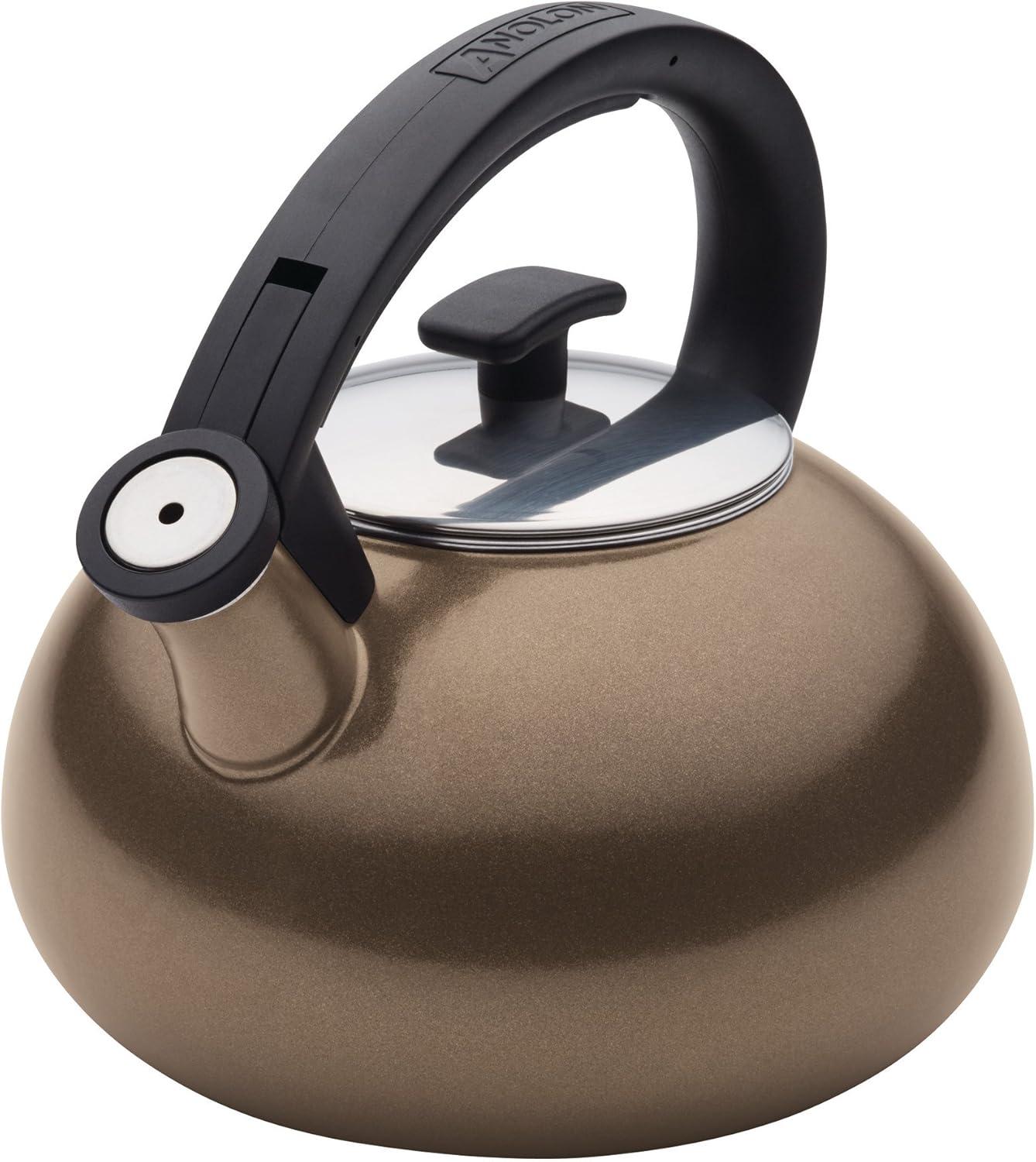 Turn teatime into dreamtime, whether it’s a single cup or an entire teapot full, with the efficiency and style of the gorgeous, durable Anolon Allume Teakettles 2-Quart Enamel on Steel Teakettle. The kettle features a n eye-catching enamel on steel exterior to add style to any stovetop. Durable steel kettle construction helps resist warping and dinging, and the gorgeous enamel exterior is easy to clean. A tight-sealing lid holds heat and steam inside, and is finished with a sturdy elegant knob. A push-release pour spout operates with a touch of the finger, and a convenient whistle sounds when water is at a boil. Whistling teakettle is suitable for all stovetops, except induction. Hand-wash recommended.