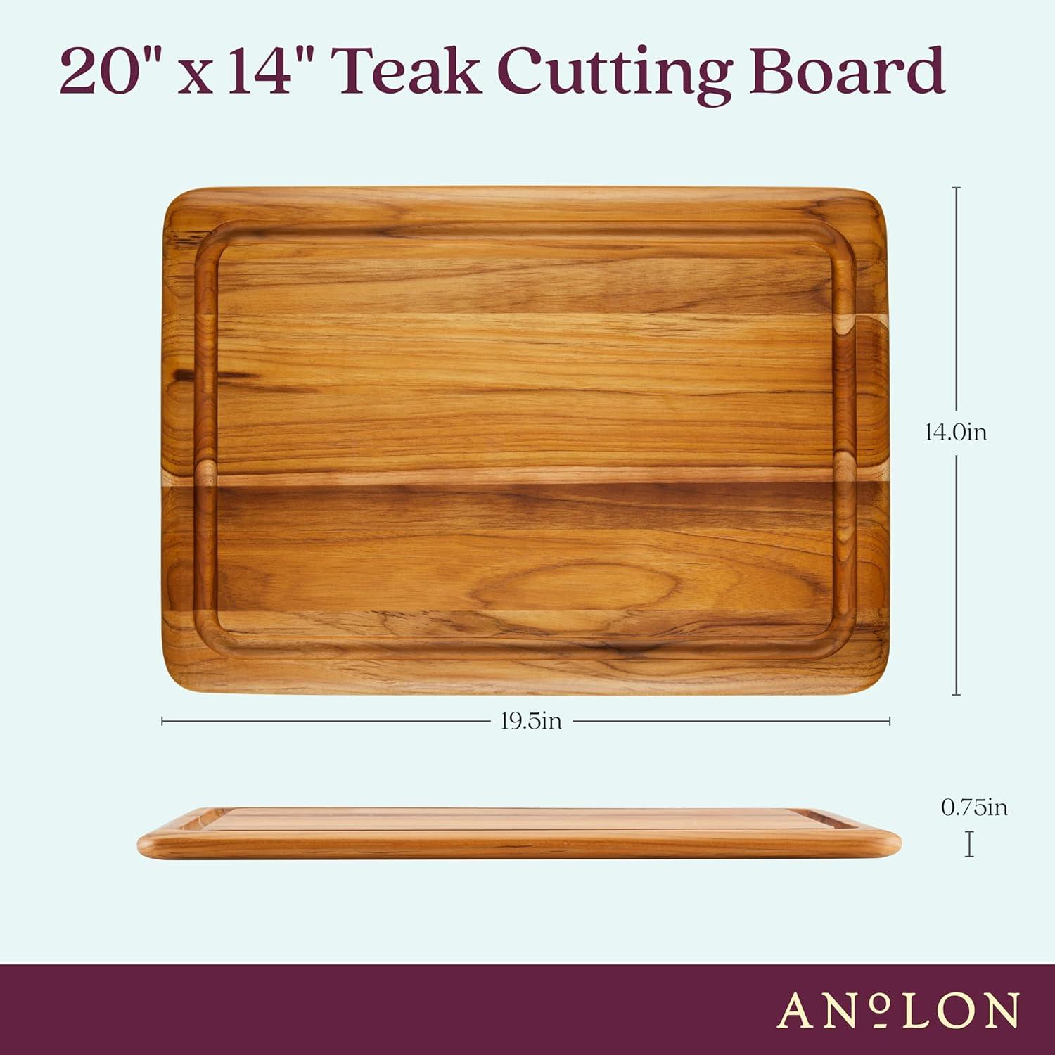 Crafted from beautiful teak hardwood, this versatile cutting, carving, serving, and presentation board features a modern, counter-friendly design that looks great on the table and works perfectly in the kitchen. Use the traditional trencher design to collect carving juices or flip the board over for a uniform, flat surface ideal for charcuterie or hors d'oeuvres presentations. Finished with a food-grade mineral oil to highlight the natural teak wood grain, this sturdy cutting board is a full 3/4-inch thick, providing maximum durability to take on chopping, slicing, and dicing from chef knives, carving knives, cleaver knives, and more. Whether for presentation or for prep, get form and function and serve in style with this 20-inch x 14-inch kitchen cutting board from Anolon Pantryware.