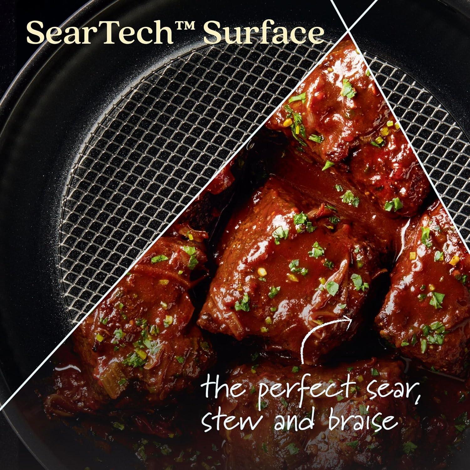 SEARS LIKE CAST IRON: No other cookware set has it. Exclusive SearTech(tm) technology combines an innovative base and stainless steel mesh engineered to keep oil in the middle of the saucepan letting heat and fats unite for incredible caramelization and browning. Create the best flavors without the bulky weight, difficult cleanup, or need for complicated seasoning.